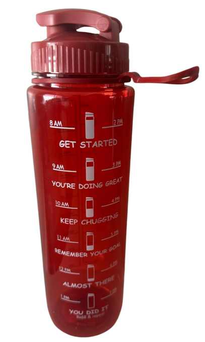 This water bottle features motivational phrases and time markers from 8 AM to 7 PM, encouraging you to stay hydrated and focused throughout the day.