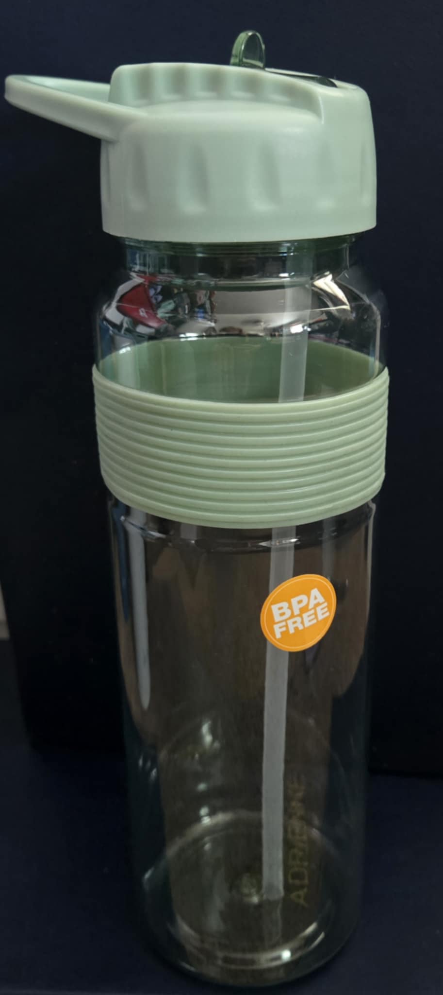 Material is plastic and BPA free. Has a silicone grip holder and a plastic flip top tab to drink from. A holdable handle at the top for easy access.