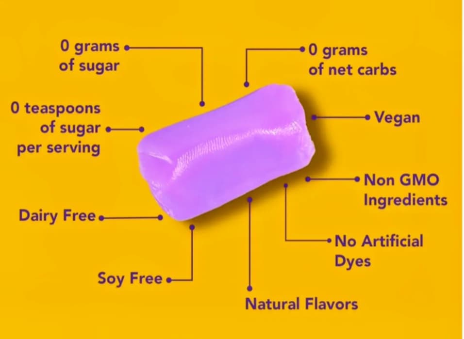 0 sugar, natural flavors, vegan, allergy free, no artificial dyes, and keto.